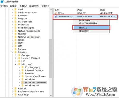 3、找到DisableAntiSpyware,鼠标右击删除;