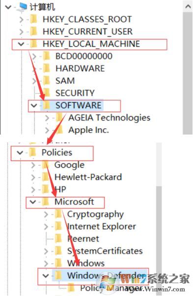 2、找到HKEY_LOCAL_MACHINE\SOFTWARE\Policies\Microsoft\Windows Defender ;