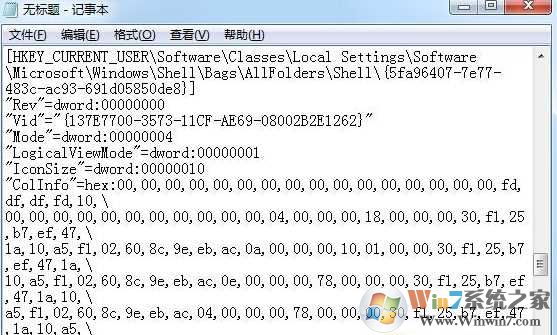 4、导入后重新启动一下win7系统,这时你发现文件和文件夹已经能自由排列了,不过有的用户出现了一些问题,”平铺视图“不见了,那么我们还要解决一下这个问题,复制下面的代码到记事本中;