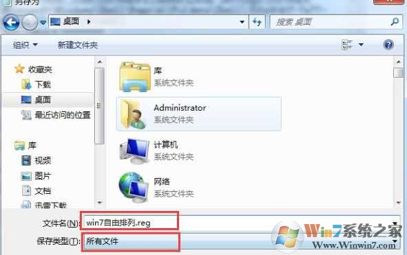 2、然后在记事本中点击菜单栏上的“文件”——“另存为”,文件类型选择为“所有文件”,并保存为“Win7自由排列.reg”